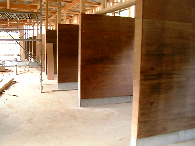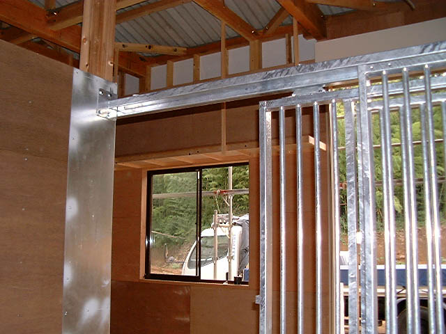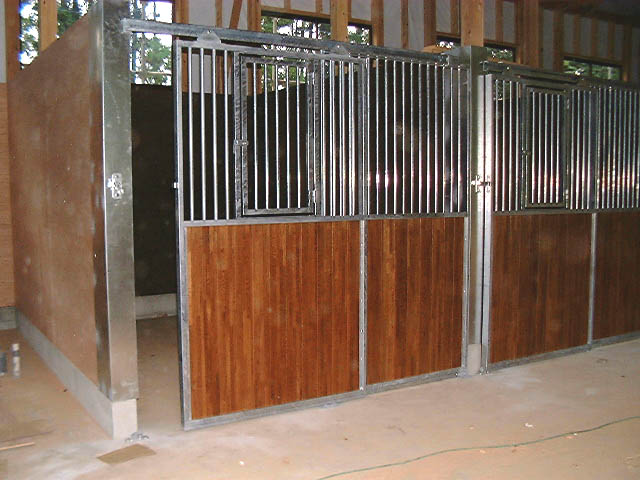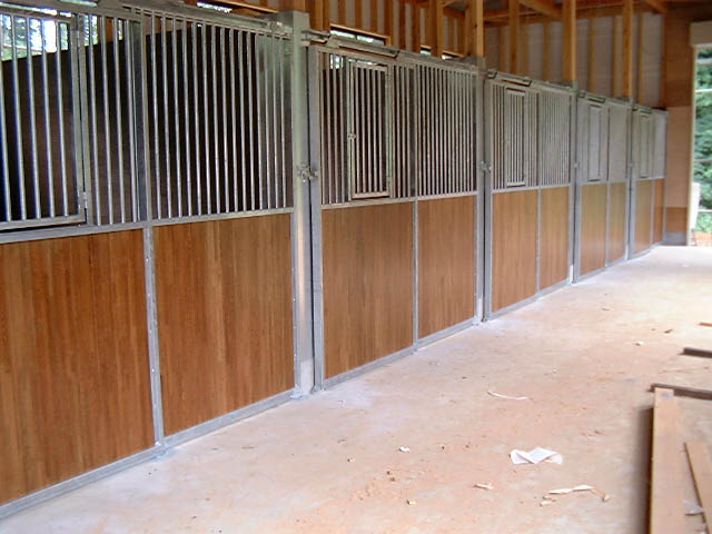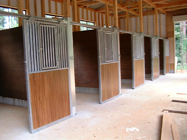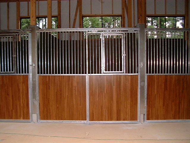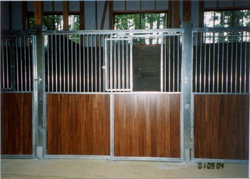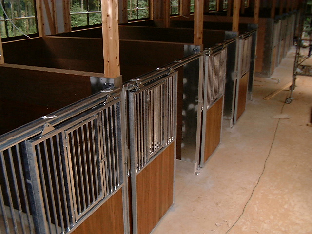 馬房パーティションは前面P/間仕切りP。腰板は本実加工を施した集成材24tに塗装をした高級な仕様。