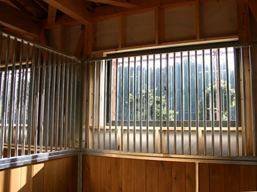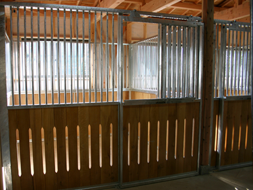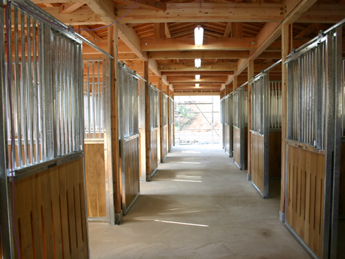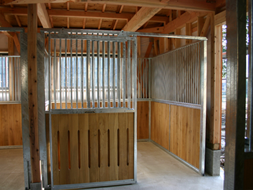 馬房パーティションを4面(前面/間仕切り/背面/側面)採用したケースです。背面Pの採用で建築の内壁は特に補強する必要がありません。 腰板には本実加工オーク無垢材を使用しています。前面Pのみ通風スリット加工。