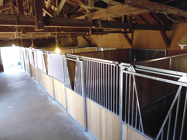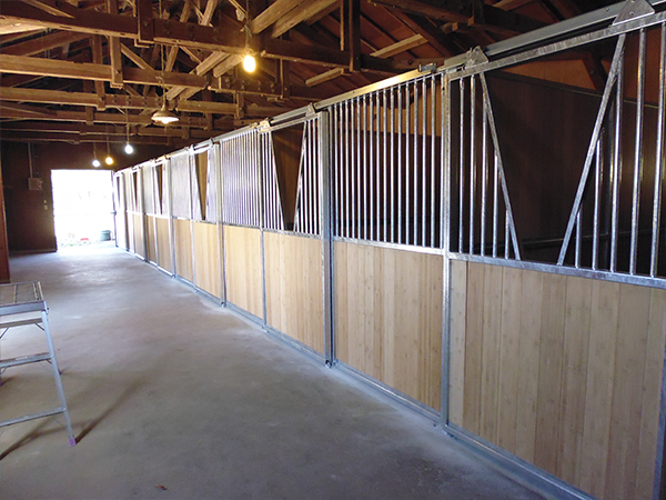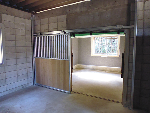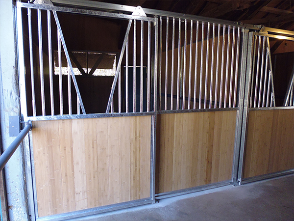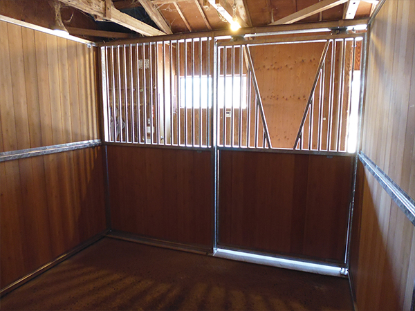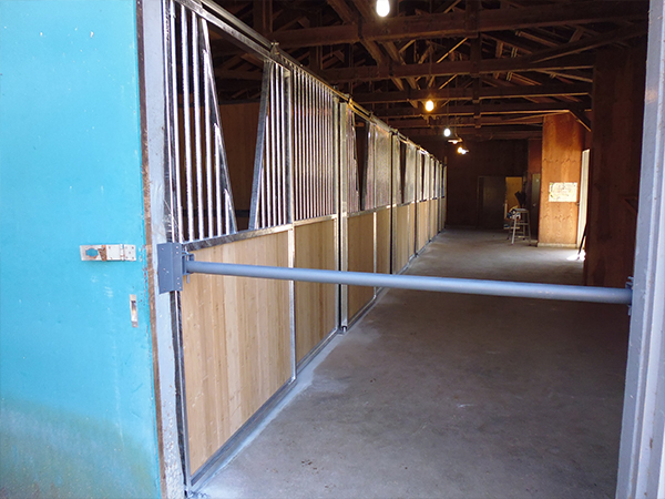 V字首出小窓。馬房パーティションは前面と間仕切りパネルのみ。腰板は本実加工を施した竹集成材24t。