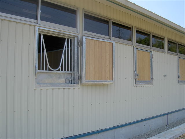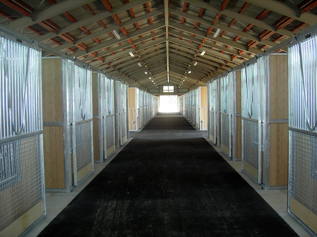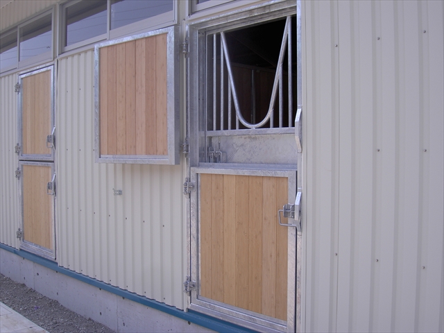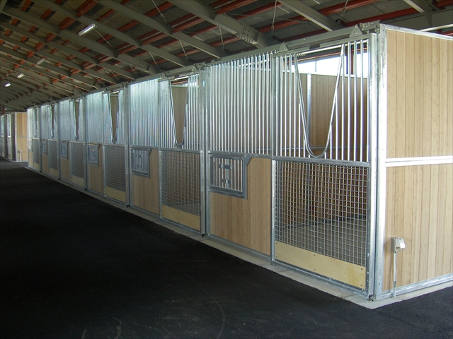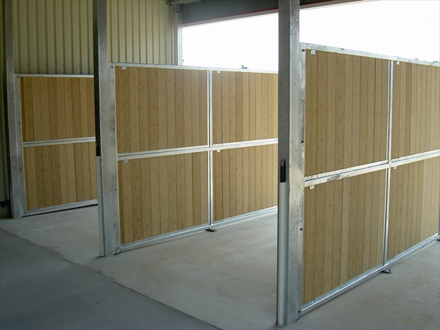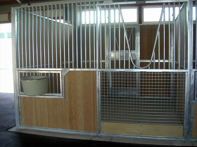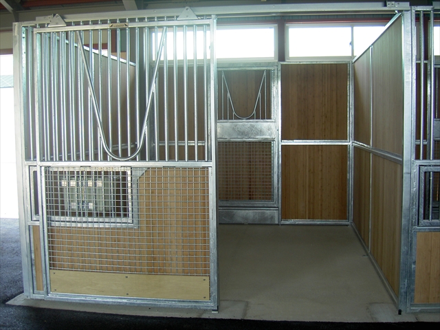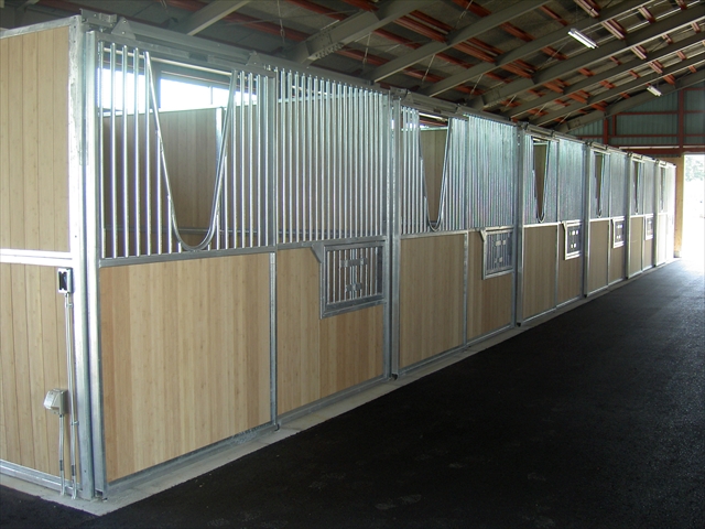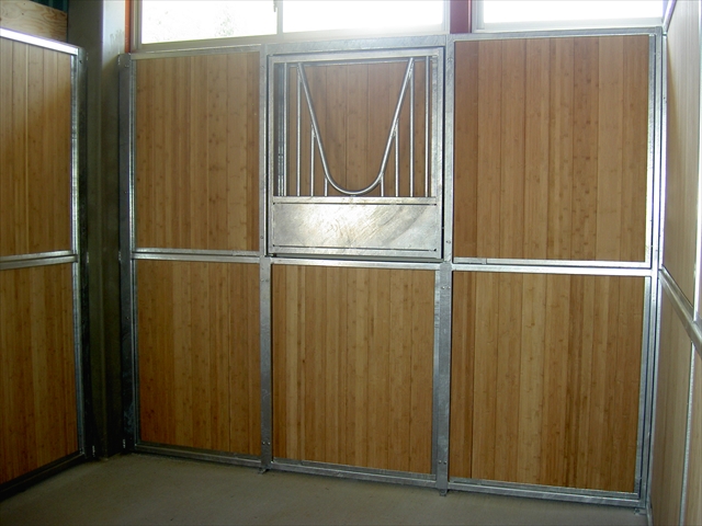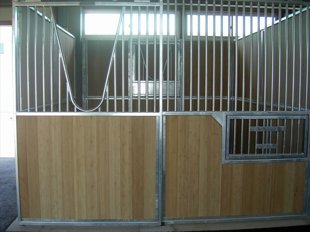 4方馬房パーティション。腰板は本実加工を施した「竹」集成材24tの高級な仕様。オプション:多数