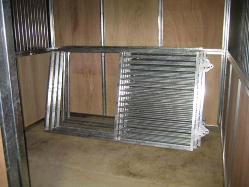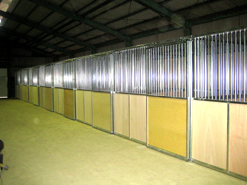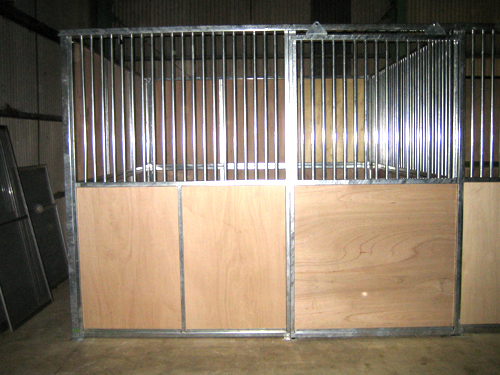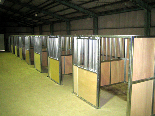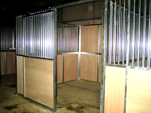 馬房パーティションを4面(前面/間仕切り/背面/側面)採用したケースです。背面Pの採用で建築の内壁は特に補強する必要がありません。 ベニヤ24t仕様。