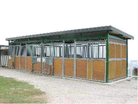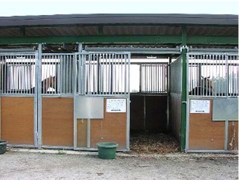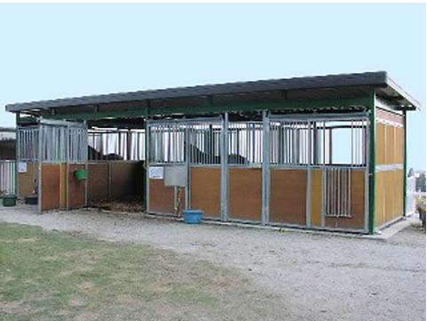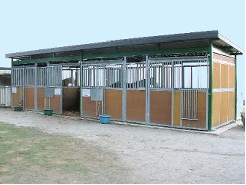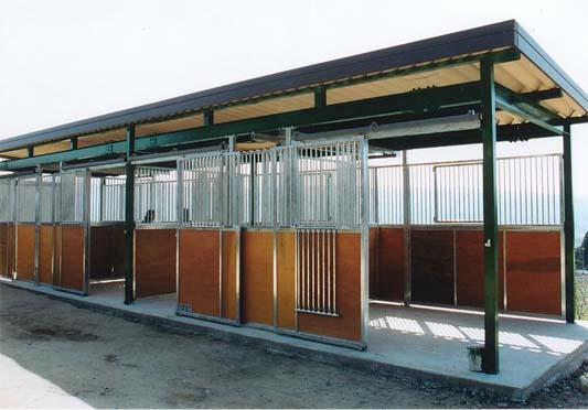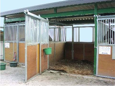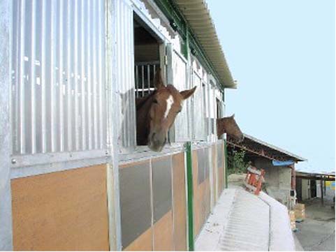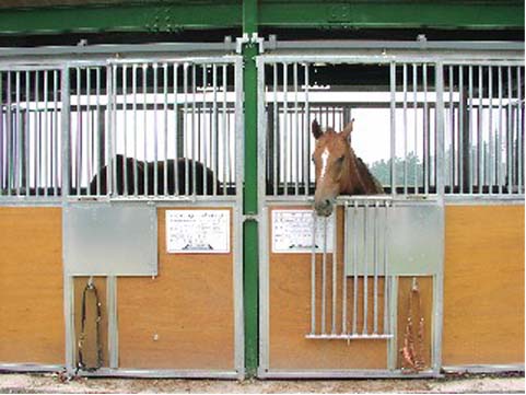 馬房パーティションを4面(前面/間仕切り/背面/側面)採用したケースです。厩舎の壁は一切建築で作っていません。腰板はベニヤ24t仕様。 可動式間仕切りで馬房の大きさが変更できます。前面パネル全体を開くことが出来ます。