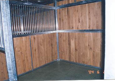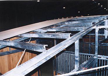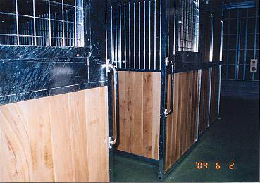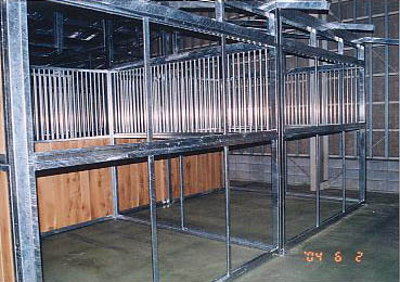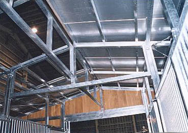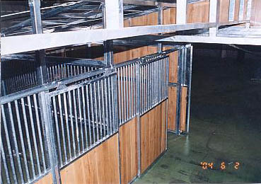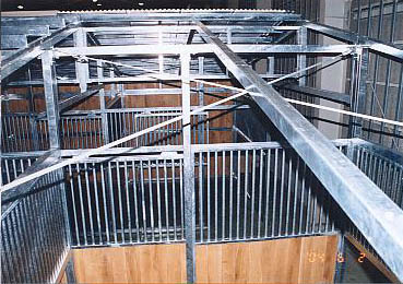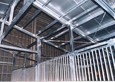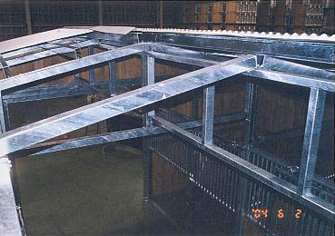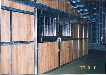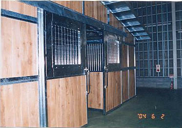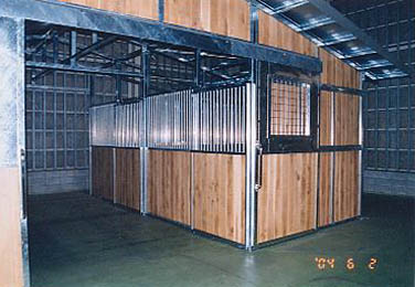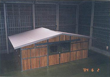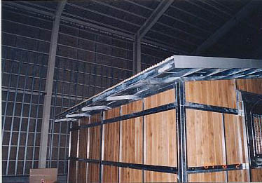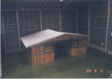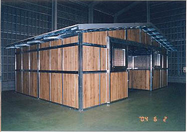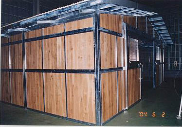 ユニット厩舎。厩舎そのものを当社施工で建設します。関連諸法/諸条例により建設には条件があります。 撮影のための建設は法令を遵守するため超大型倉庫内で行いました。