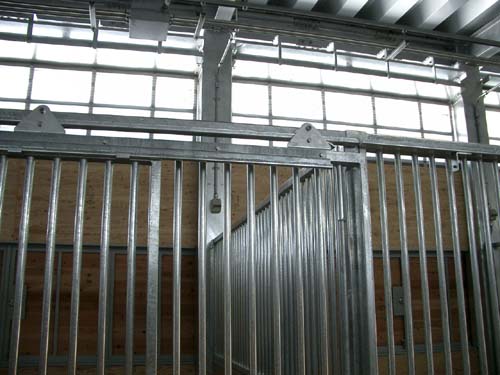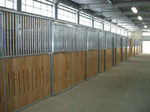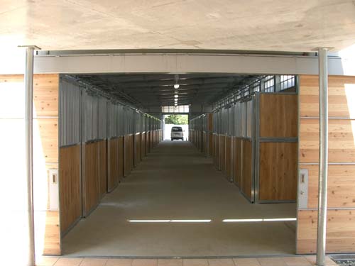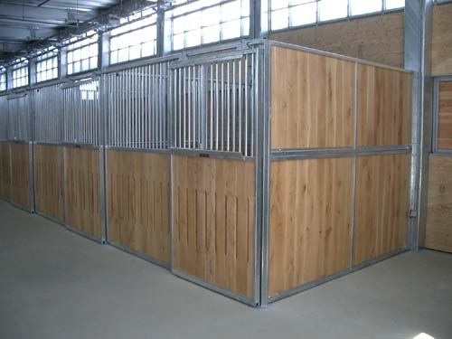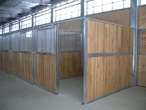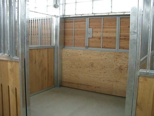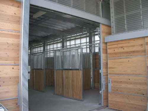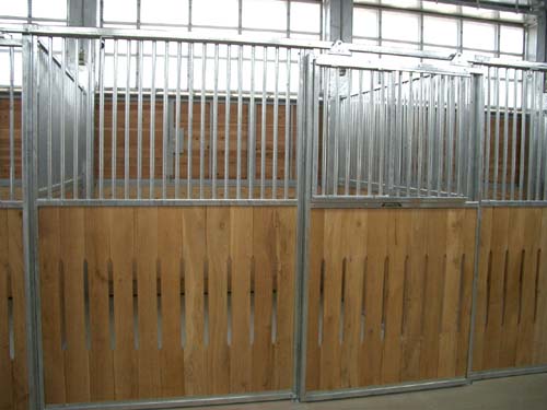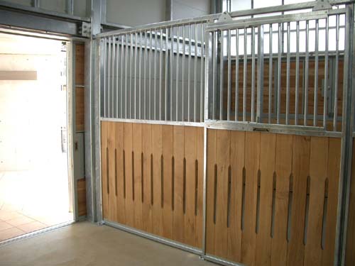 馬房パーティションを3面(前面/間仕切り/側面)採用したケースです。  背面Pの採用で建築の内壁は特に補強する必要がありません。 腰板には本実加工オーク無垢材を使用しています。前面Pのみ通風スリット加工。