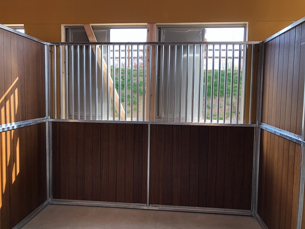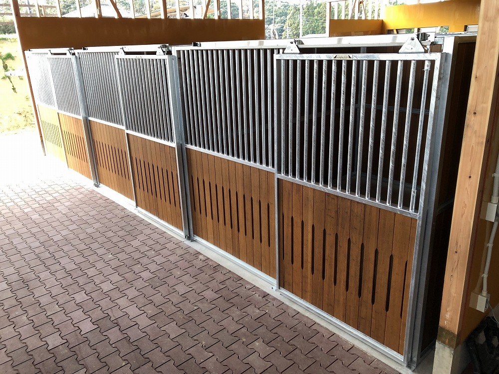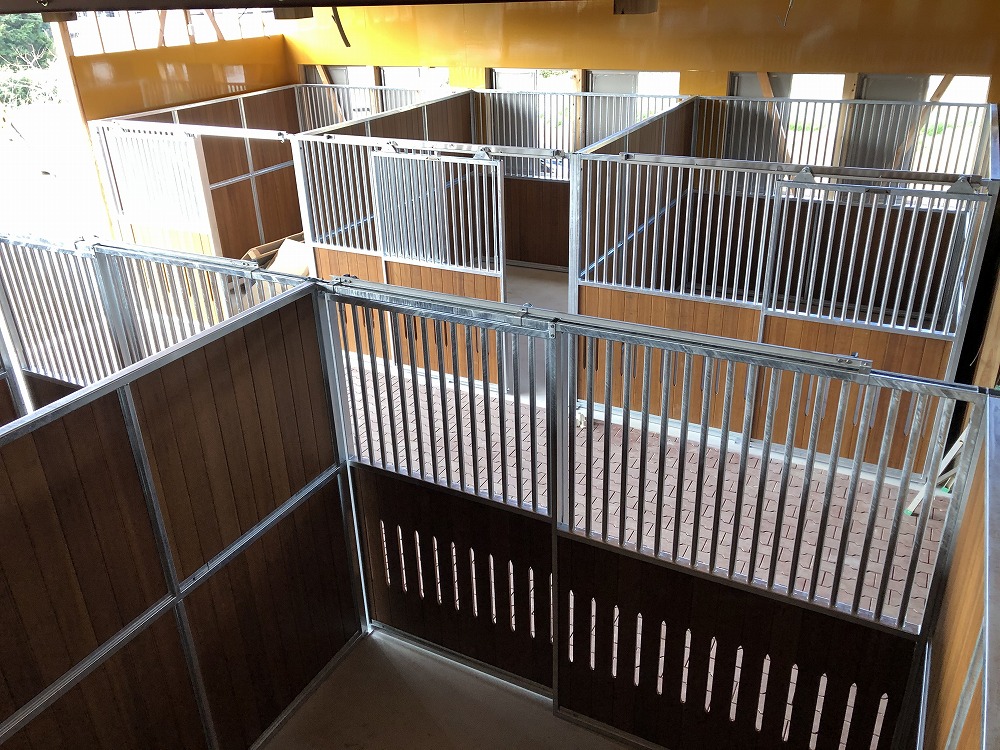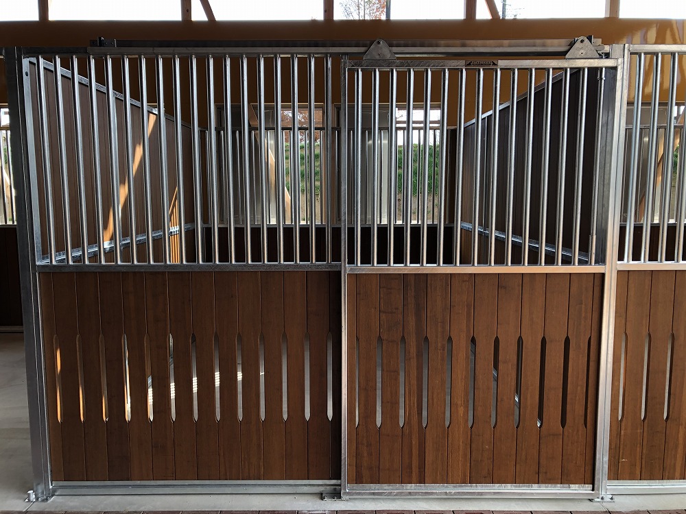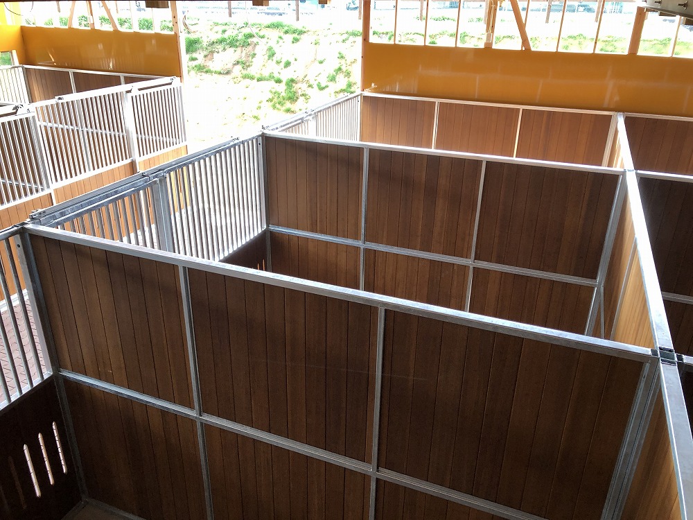 こちらでご紹介している「馬房パーティション/馬房パネル」本厩舎用です。確実に取り付けるため本職による組み立て施工が必要です。 強固なコンクリート床を必要とします。床レベルが極端に悪い場所には設置できません。床レベルが悪い場合は下部に隙間ができ、 敷き藁やおがくずが通路に出てくるだけでなく「つまずき」など厩舎事故の原因になります。