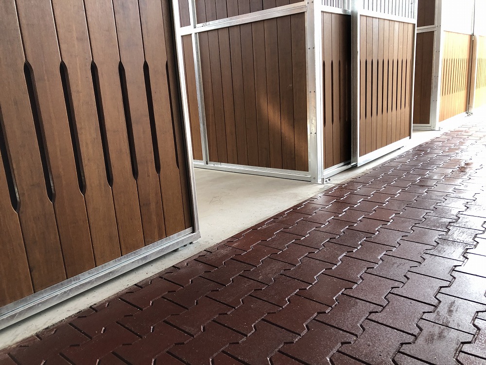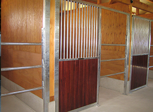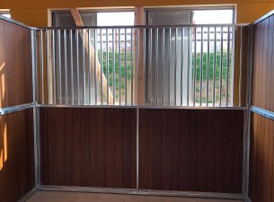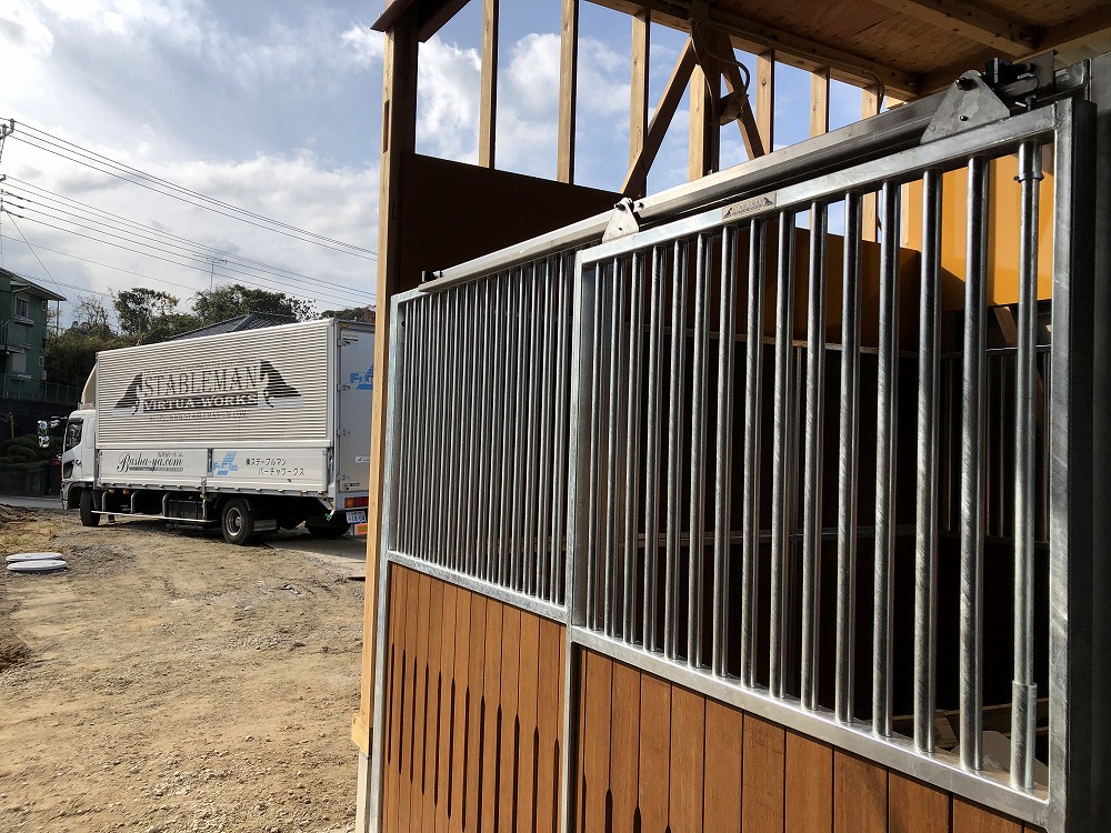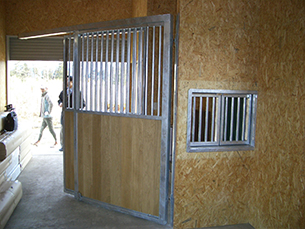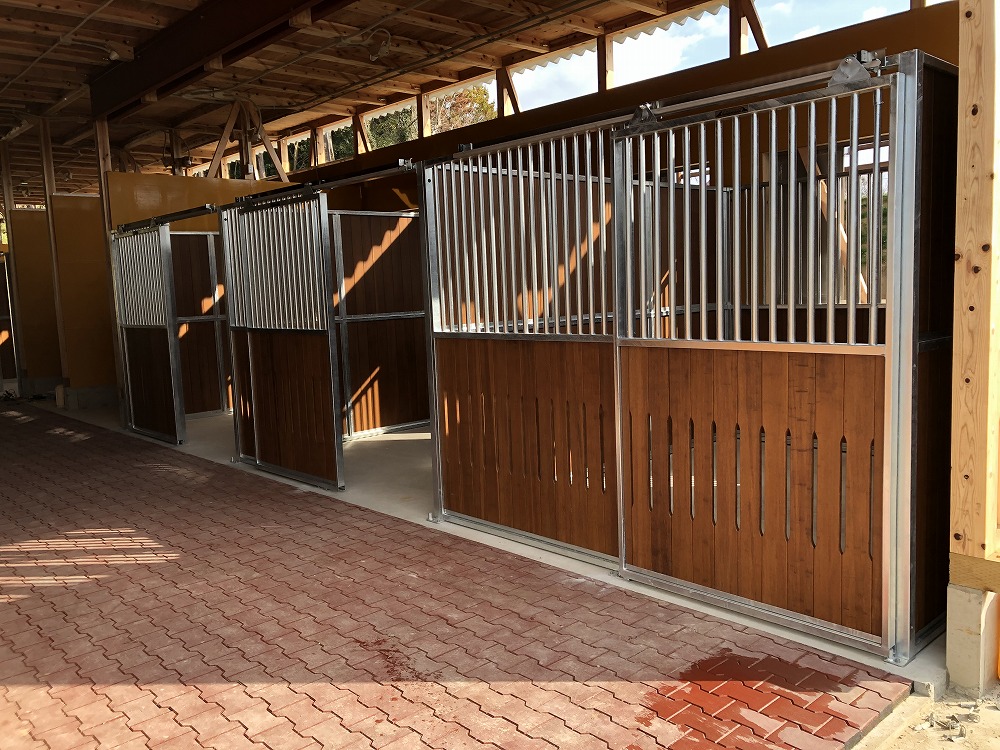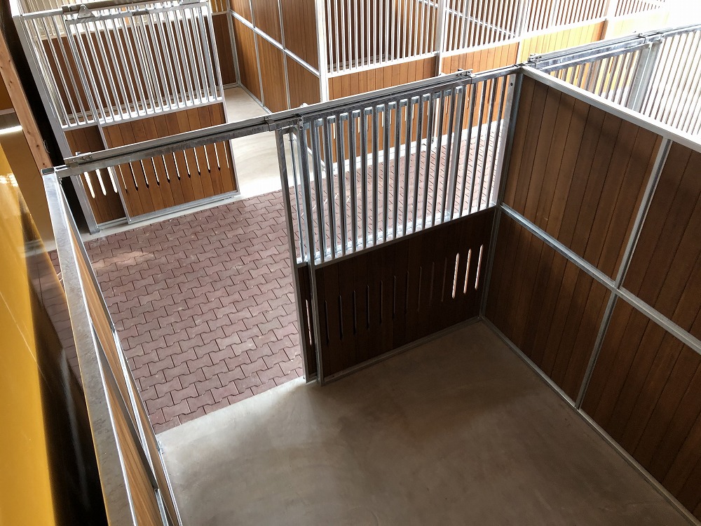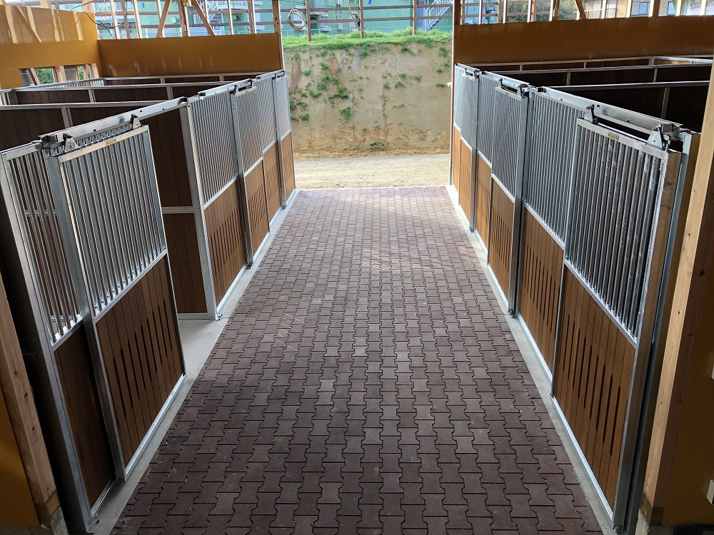 こちらでご紹介している「馬房パーティション/馬房パネル」本厩舎用です。確実に取り付けるため本職による組み立て施工が必要です。 強固なコンクリート床を必要とします。床レベルが極端に悪い場所には設置できません。床レベルが悪い場合は下部に隙間ができ、 敷き藁やおがくずが通路に出てくるだけでなく「つまずき」など厩舎事故の原因になります。