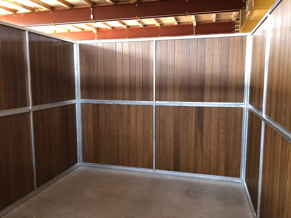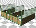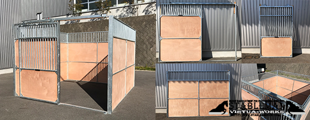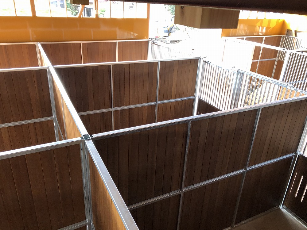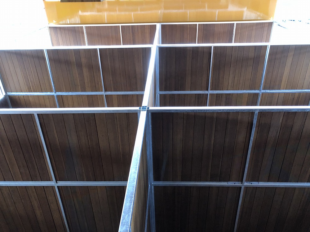 組み立てると3メートル角の馬房が完成します。横一列に配置する場合のみ無限に追加して馬房を増やすことができます。