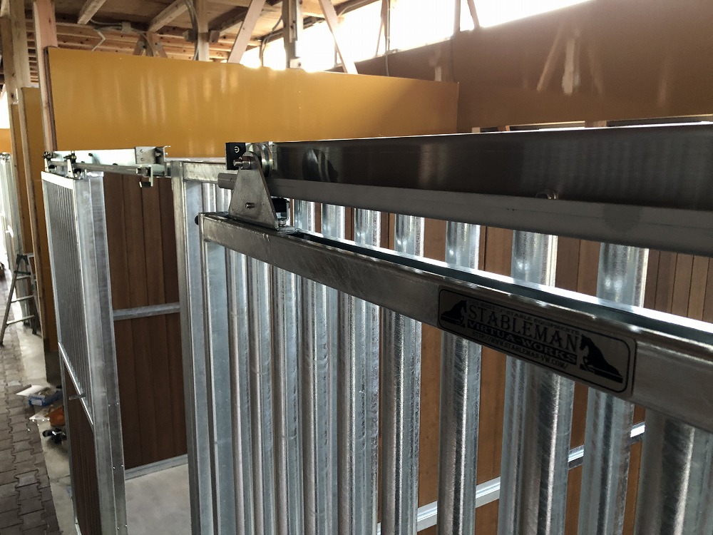 厩舎通路をあまり広くとれない状況ではスライドドアは有効です。 開閉の度に体をよける必要がある蝶番式のドアより こちらの方が良いと考え当社では標準仕様としています。