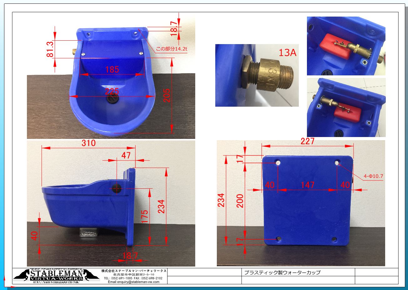 馬が水を飲むとフロートが下がり弁が開き水が供給され自動的に同じ水位を保ちます。 底の栓(黒)が取り外せて掃除する際に便利です。